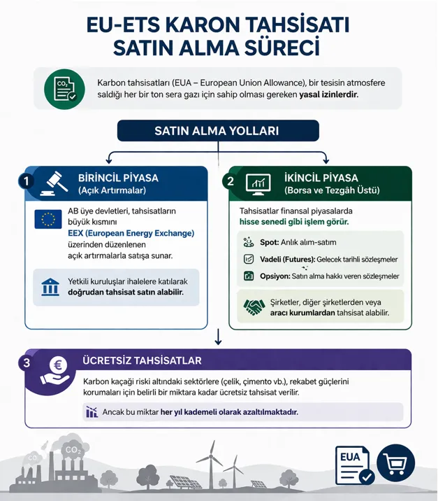 EU-ETS karbon tahsisatları (EUA), temel olarak iki farklı kanal üzerinden tedarik edilir. Birincil piyasada, Avrupa Birliği üye devletleri adına EEX (European Energy Exchange) platformu üzerinden düzenlenen düzenli açık artırmalara katılarak doğrudan ihale yoluyla satın alma yapılabilir. İkincil piyasada ise şirketler, finansal aracı kurumlar veya enerji borsaları (ICE, EEX vb.) üzerinden hisse senedi alır gibi anlık veya vadeli sözleşmelerle diğer piyasa katılımcılarından tahsisat devralabilirler. Ayrıca, karbon kaçağı riski taşıyan belirli sanayi kollarına devlet tarafından her yıl belirli bir miktarda ücretsiz tahsisat tanımlanmaktadır.