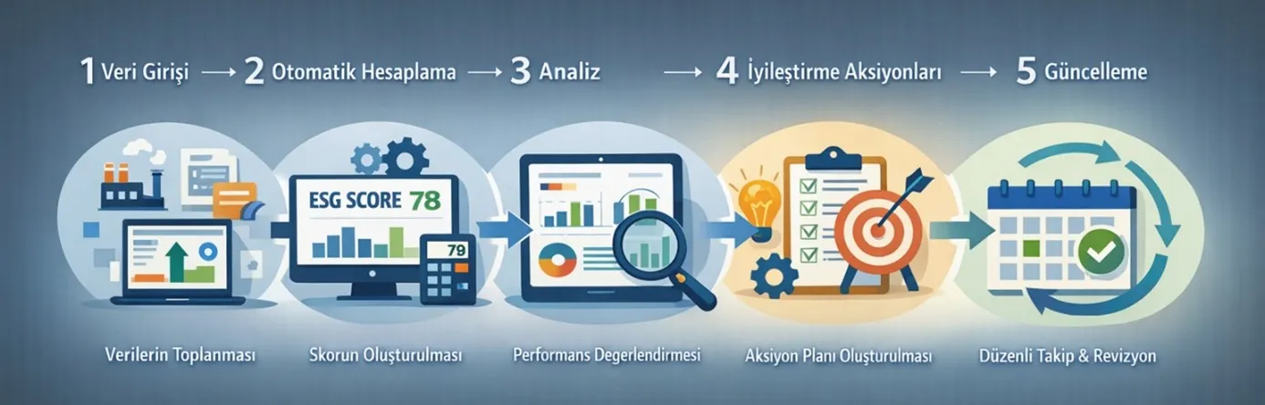 Sürdürülebilirlikte hesaplama, veri kaynağının işlenerek standartlara göre değerlendirilmesi ve raporlamasına kadarki uçtan uca dijital süreci ele alır. Etkin sürdürülebilirlik yazılımına farklı kaynaklardan gelen verilerin, uluslararası standartlara uygun şekilde işlenerek otomatik olarak hesaplanması ve bu hesap sonucunda çıkan skorların izlenebilir ve denetlenebilir olması sağlanır. Bu sayede sürdürülebilirlik hesaplamalarının dinamik, revize edilebilir ve sürekli yönetilebilir olması sağlanır.
